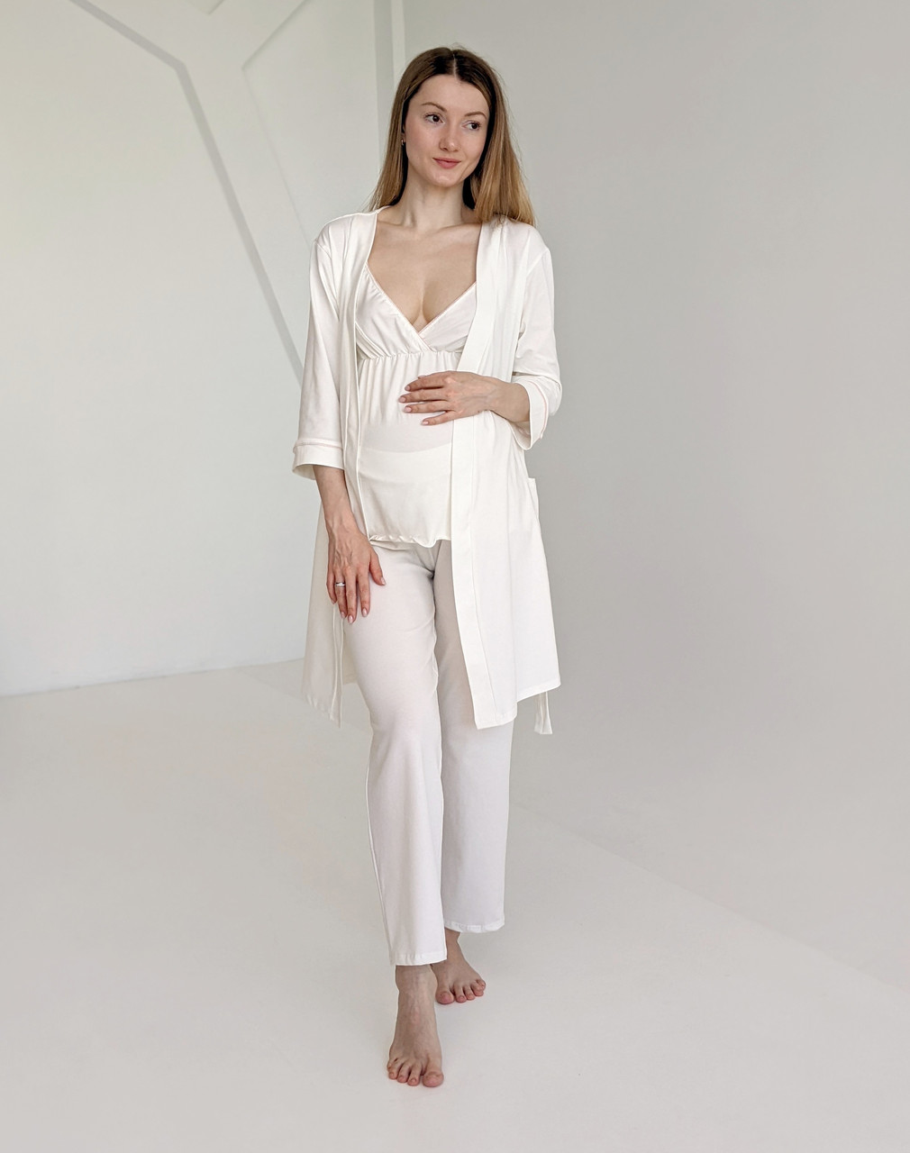 Комплект складається з вкороченого халатика, майки та штанів. Майка має спеціальний доступ до грудей, для зручного грудного вигодовування.